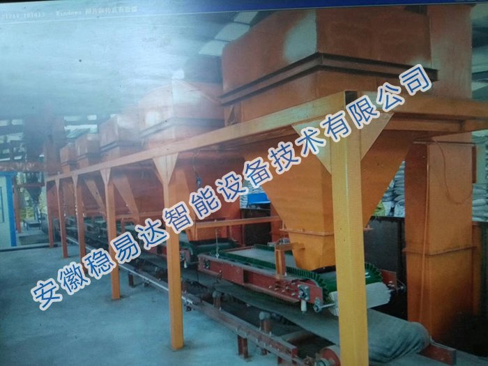 5、将混合好的肥料自动卸至包装机料仓,包装秤按照设定的重量将物料充填入包装袋,经输送机送往缝包机工位,自动缝包,完成定量包装过程。 实现整个配料包装线的自动化,保证其连续、高效、稳定的工作。